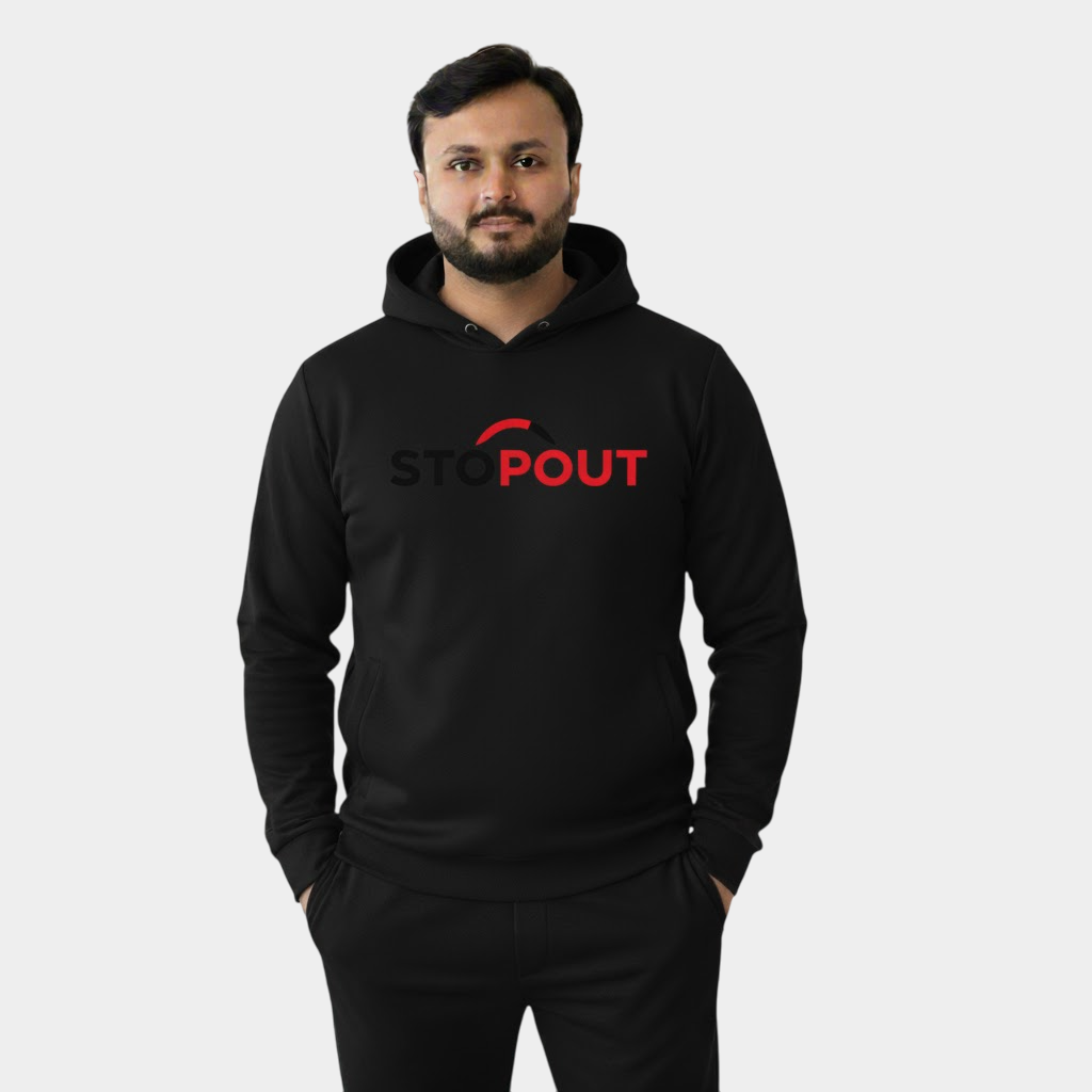 Red STOP OUT logo on both hoodie and joggers